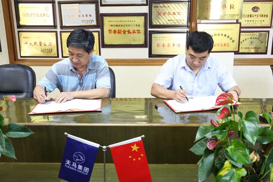 天馬科技陳慶堂董事長(右)與福建師范大學(xué)福清分校陳盛校長(左)簽訂校企戰(zhàn)略合作協(xié)議