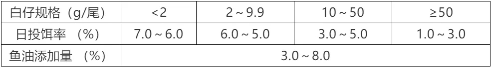 ? 根據存池白仔的規格及數量、氣候、水溫、水質、白仔的生長及攝食狀況等因素進行適當地調整。